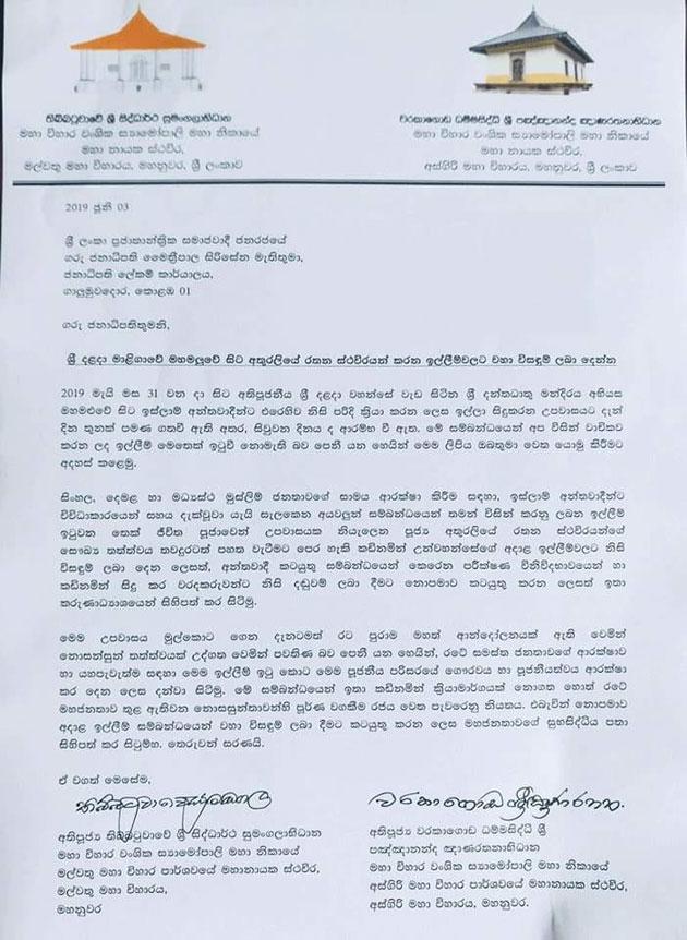 ජනපතිට - අගමැතිට මහනාහිමිවරුන්ගෙන් ලිපියක්