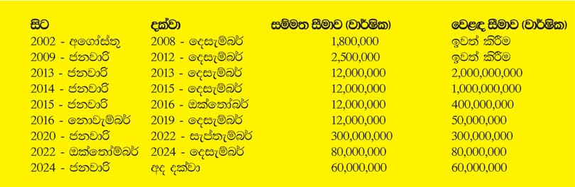 වැට් බදු ලියාපදිංචි කිරීමේ සීමාවන්හි පහත කාලානුක්රමය මෙම ප්රතිපත්තියේ අනනුකූලතාව සහ ඒ සම්බන්ධ අනවබෝධය මනාව විදහා දක්වයි.
