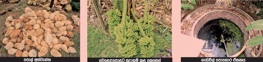 “මේ තියෙන භව බෝගවලට මොනව හරි පලිබෝධ හානියක් ආවොත් ගොවිපොළ ඇතුලෙම හදාගන්න ද්රාවණයක් තමයි පාවිච්චි කරන්නේ. හරක් කන්නේ නැති කොළ වර්ග දහයක් වනේ දාලා කොටලා හදාගන්න දාවණයක් තමයි වගාවට ඉහින්නේ. කොහොඹ, ගම්මිරිස්, වල් සුරියකාන්ත, බුලත්, නික, කදුරු, කෝමාරිකා, මී, නත්තසුරිය, පේර වගේ කොළවලින් තමයි මේ ද්රාවණය හදාගන්නේ.”