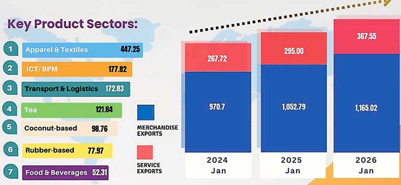 ඒ අනුව මෙහිදී භාණ්ඩ හා සේවා අපනයනය යටතේ 2026 ජනවාරි මාසයේදී ඩොලර් මිලියන 1,165.02 ක ආදායමක් රැස් කරගෙන ඇති අතර, එය 2025 ජනවාරි වාර්තා වූ ඩොලර් මිලියන 1,052.79 හා සැසඳීමේදී සියයට 10.66 ක වර්ධනයකි.