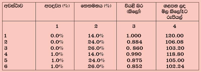 අනෙකුත් වෙළෙඳපොළ සාධකවල බලපෑම නියත ව පවතී යැයි උපකල්පනය කර, වෙනස් වන තෙතමනයේ හා අපද්රව්යවල ප්රමාණය අනුව වීවලට ගෙවිය යුතු මිල (ගළපන ලද මිල) ගණනය කළ හැකි ය. වියළි වී කිලෝවක අවම මිල රු.120ක් වන විට, තෙතමනයේ හා අපද්රව්යවල විවිධ ප්රමාණයට අනුව ගළපන ලද මිල මෙම වගුවේ 4 තීරුවේ දැක්වේ.