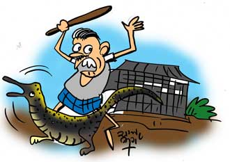 කෝපය ඉහවහා ගියේය. ඔහු අත තිබූ පොල්ලෙන් කබරයාට තඩි බාන්න පටන් ගත්තේ ය. ඔහු ගහන ගහන පාරට තඩි කබරයා පිඹ පිඹ බඩ පිම්බුවේ ය. කබරයා ද මේ පොලු ප්රහාරය හමුවේ නිහඬව නොසිටියේ ය. ඌද උගේ වලිගයෙන් ඔහුට ප්රහාරයක් එල්ල කළේය. එය කඩු ප්රහාරයකට සමාන වුවකි. ඒ ප්රහාරයෙන් ඔහුගේ දෙපා කැපී ගියේ ය. ලේ ගැලුවේ ය. ඒ සමගම ඔහුගේ මරළතෝනිය ගමටම ඇසුණේ ය. ගම්මු එතනට දිව ආහ. ඔහු රෝහල් ගත කෙරිණ.
