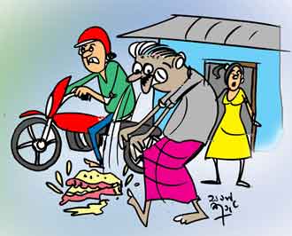 ‘‘ අනේ මාමේ, මම එන ගමන් නයිට් කඩයකින් මේ කේක් එක අරගෙන ෂොපින් බෑග් එකට දමලා බයිසිකලේ එල්ලුවා. මගදි ඒ.ටී.එම්. එකකින් සල්ලි ගන්න බයිසිකලේ නතර කරලා ගියා. මම ආපහු එනකොට කොහේදෝ හිටපු බල්ලෙක් මේ කේක් එක බාගයක්ම කාලා” යැයි කියමින් පලුවක් නැති කේක් ගෙඩිය පියාට පෙන්නුවේය.