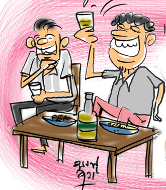 දහවල් වනවිට මළගෙදර මිතුරා කෑමට පෙර පොඩි “ෂොට්” එකක් ගනිමු නේදැයි අසමින් මත්වතුර බෝතලයක් හා ඊට ඇවැසි කළමනාද ගෙනැවිත් දුන්නේය. අපේ කතානායකයා සමග බොන්න සෙට් වුණේ තවත් එක් අයකු පමණි. බීමතින් රිය පැදවීමේ චෝදනාවට ලක්විය නොහැකි බැවින් බොහෝ දෙනකු කනගාටුවෙන් වුවද අමද්යප වීමට තීන්දු කළහ. දුම්රියෙන් ගිය අනෙක් සගයාද මිතුරාගේ බලවත් ඉල්ලීමට එක් වඩියකින් පමණක් සප්පායම් විය.