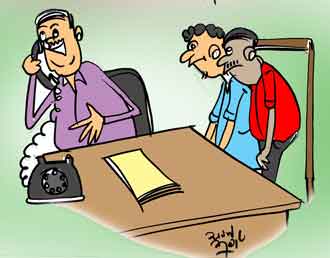මෙම  නිලධාරියා  අලු‍ත්  පුටුවේ  වාඩිවී  පැයක්  ඉක්ම යන්නට  මත්තෙන්   කනිෂ්ඨ  නිලධාරියෙක්  හා  සේවකයෝ  දෙදෙනෙක්.  ඔහුගේ කාමරය ඉදිරිපිට පෙනී සිටියහ. වීදුරු දොරෙන් ඔවුන්  දකින  මෙම නිලධාරියා ඔවුන්ට ඇතුළට එන්නැයි  සංඥා කරමින්ම දුරකතනයේ  රිසීවරය කනේ  තබාගත්තේය. ඇතුළට පැමිණි සේවකයන්ට පොඩ්ඩක්  ඉන්න යැයි  අතින් සංඥා කරමින් ඔහු දුරකතන ඇමතුමට පිළිතුරු  බැන්දාය.