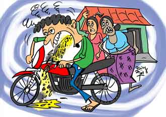 ගෙවී ගියේ පැය තුනක පමණ කාලයකි. නිවසින් ලැබුණු ආහාරයද ගෙන ඔහු සිය යතුරුපැදියෙන් නිවස බලා ගමන් කළේ ඉතා අපහසුවෙනි. යතුරුපැදිය නිවසේ මිදුලේ නතර වෙනවාත් සමඟම ඔහුගේ මුවින් පිටවූයේ මහත් හඬක් නගමින් ඔක්කාරයකි. මේ හඬ ඇසී එම ස්ථානයට දිව ආ මවත් බිරිඳත් මේ මොකද අසනීපයක් වත් දැයි විමසා ඔහු අසලට ළංවෙනවාත් සමඟම ඔහුගේ ළඟින් ආ දුර්ගන්ධය ඔක්කාරයට හේතුව ඔවුන්ට තේරුම් ගැනීමට හැකි විය.