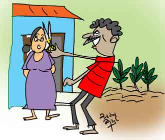 හදිසියේම භාර්යාව ඔහුට අඬගැසුවේ පැළ සිටුවීමට ගත් කතුර සොයා ගැනීමටය. ඒ මුළුතැන් ගෙයි වැඩක් සඳහා කතුර උවමනා බැවින්ය. ඔහු කතුර අතන ඇති මෙතන ඇති යයි කියමින් කීවේය. කතුර සොයා දෙන ලෙස භාර්යාව ඔහුට වද කළාය. කතුරට වූ දෙය ඔහුට සිහිවූයේ එවිටය. දෙයියනේ අන්තිම පැළය සිටුවීමට යාමේදී ඔහු පැළයත් සමග කතුර දමා වළලන්ට ඇතැයි සිහිවූවේය. මෙය භාර්යාවට පැවසුවහොත් නාගන්ට වන නිසා චුට්ටක් ඉන්න යයි කියමින් ඔහු භාර්යාවට හොරෙන් වංගුවක් දමා ගොස් කඩෙන් මිට කහපාට කතුරක් ගෙනැවිත් එහි මඩ තවරා හෝදා දුන්නේ පරණ කතුර වගේ පෙනෙන්නලු.