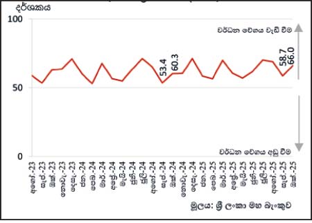 මෙය පසුගිය සැප්තැම්බර් මාසයේදී සටහන් වූ 58.7 ක අගයට සාපේක්ෂව වැඩි වේගයකින් ඉහළ යෑමක් ලෙස සඳහන් වන බව මහ බැංකුව පවසයි. මෙහිදී සියලු අංශයන්හි සිදු වූ ශක්තිමත් ක්රියාකාරීත්වය ඊට හේතු වී තිබේ.