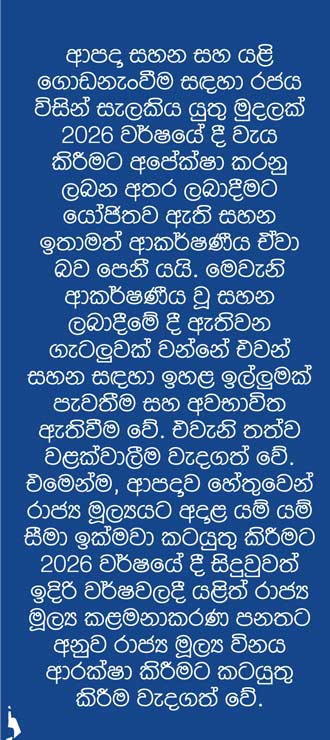ආපදා සහන සහ යළි ගොඩනැංවීම සඳහා රජය විසින් සැලකිය යුතු මුදලක් 2026 වර්ෂයේ දී වැය කිරීමට අපේක්ෂා කරනු ලබන අතර ලබාදීමට යෝජිතව ඇති සහන ඉතාමත් ආකර්ෂණීය ඒවා බව පෙනී යයි. මෙවැනි ආකර්ෂණීය වූ සහන ලබාදීමේ දී ඇතිවන ගැටලුවක් වන්නේ එවන් සහන සඳහා ඉහළ ඉල්ලුමක් පැවතීම සහ අවභාවිත ඇතිවීම වේ. එවැනි තත්ව වළක්වාලීම වැදගත් වේ. එමෙන්ම, ආපදාව හේතුවෙන් රාජ්ය මූල්යයට අදාළ යම් යම් සීමා ඉක්මවා කටයුතු කිරීමට 2026 වර්ෂයේ දී සිදුවුවත් ඉදිරි වර්ෂවලදී යළිත් රාජ්ය මූල්ය කළමනාකරණ පනතට අනුව රාජ්ය මූල්ය විනය ආරක්ෂා කිරීමට කටයුතු කිරීම වැදගත් වේ. රාජ්ය වියදම් ඉහළ යත්ම විදේශ විනිමයට අමතරව ඉල්ලුමක් ඇතිවන අතර එම ඉල්ලුම අමතරව ලබාගනු ලබන විදේශ ණය මගින් සපයා ගැනීම හැකිතාක් දුරට සීමා කිරීම වැදගත්ය. ඒ මන්දයත් අමතර ණය ගැනීම් හේතුවෙන් ලංකාවේ ණය බර තවදුරටත් ඉහළ යන බැවින් සහ ණය ආපසු ගෙවීමේ හැකියාව තවමත් පවතින්නේ ආර්ථික අර්බුදයට පෙර පැවති තත්වයේම වන බැවිනි. වෙනත් වචනවලින් ප්රකාශ කළහොත් අප තවමත් ණය ගෙවීමේ හැකියාව වර්ධනය කරගත් බවක් පෙනෙන්නට නැත. 2025 වර්ෂයට අදාළව දැනට ඉදිරිපත්ව ඇති අපනයන දත්ත අනුව මෙම කරුණ මනාව පැහැදිලි වේ. එබැවින් කඩිනමින් විදේශ ආයෝජන සහ අපනයන ප්රවර්ධනය සඳහා අවධානය යොමු කළ යුතුව ඇත.