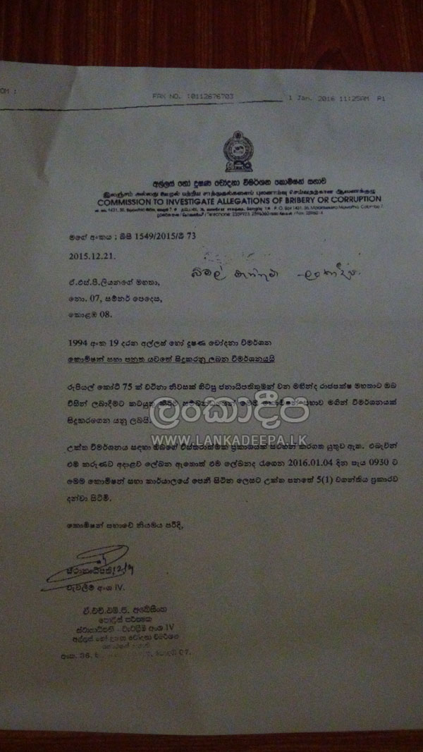 අල්ලස් හා දූෂණ කොමිසමේ කැඳවුමක් මත කොළඹ ඉඩම් ව්යාපාරික හා හිටපු තානාපතිවරයකු වූ ඒ.එස්.පී. ලියනගේ අද (4) ප්රකාශයක් ලබාදීමට එහි පැමිණියේය.