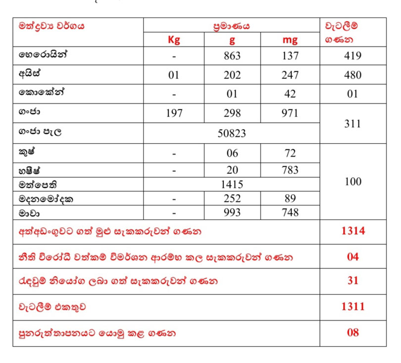 එම මෙහෙයුමේදී අත්අඩංගුවට ගන්නා ලද විෂ මත්ද්රව්ය සහ සැකකරුවන් ප්රමාණ මෙසේය.