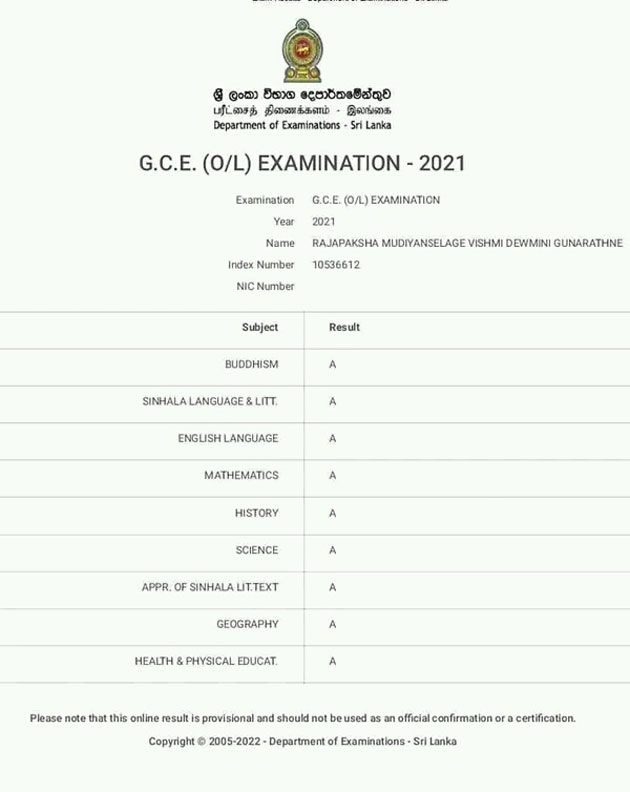 ශ්රී ලංකා කාන්තා ක්රිකට් ජාතික කණ්ඩායම නියෝජනය කරන විශ්මි ගුණරත්න (17) මෙවර අ.පො.ස සාමාන්ය පෙළ විභාගයෙන් ඒ සාමාර්ථ 9 ක් සහිතව සමත් වී ඇත.