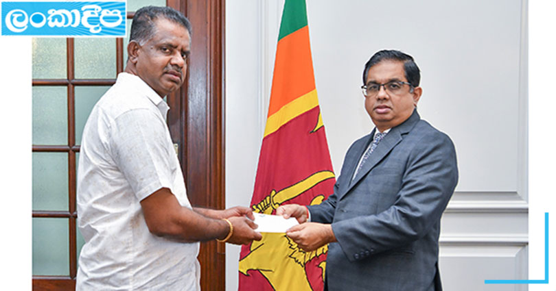 දමින්ද දිසානායක මහතා රුපියල් මිලියනයක චෙක්පත ජනාධිපති ලේකම් ආචාර්ය නන්දික සනත් කුමානායක මහතාට ජනාධිපති ලේකම් කාර්යාලයේදී පිළිගැන්වූ අවස්ථාව.