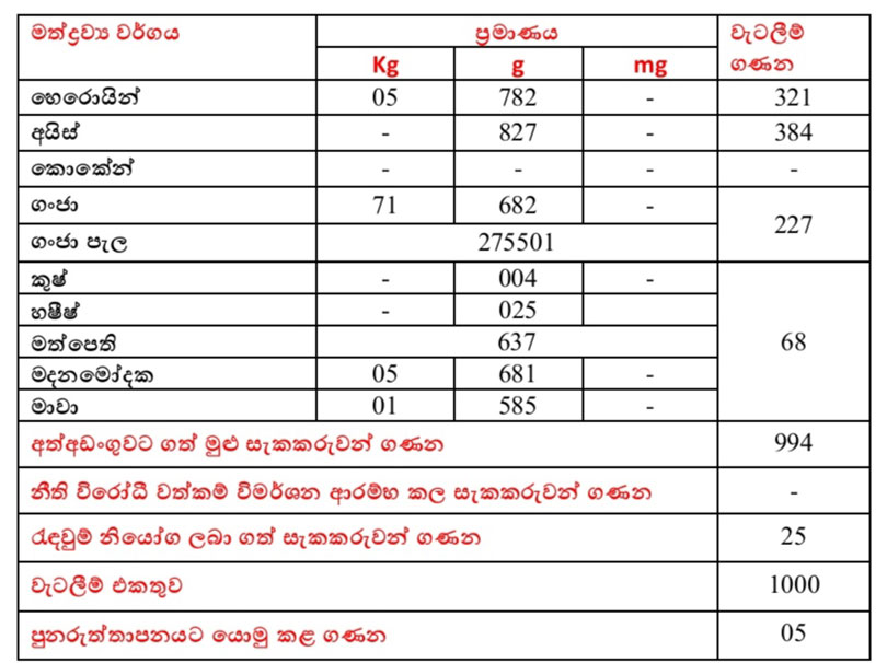 ඒ අනුව අත්අඩංගුවට ගනු ලැබූ සැකකරුවන් සහ මත්ද්රව්ය ප්රමාණ මෙසේය.