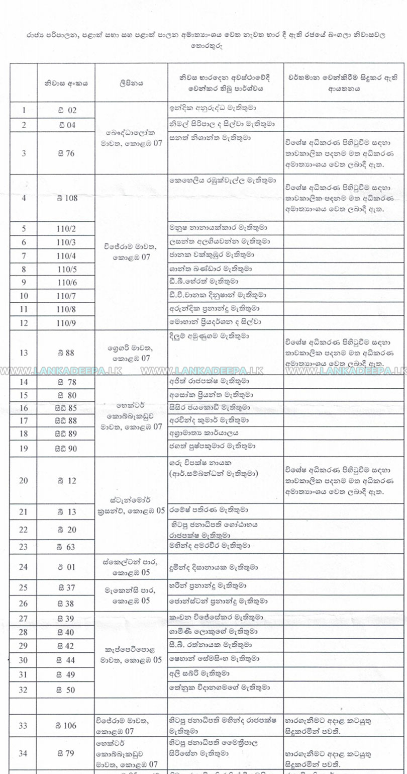 හිටපු ජනාධිපතිවරුන්, මැති ඇමතිවරුන් සහ මන්ත්රීවරුන් රජයට ආපසු භාරදෙන ලද නිවාස පිළිබඳ තොරතුරු රාජ්ය පරිපාලන පළාත් සභා සහ පළාත් පාලන අමාත්යාංශය විසින් දක්වා තිබේ.