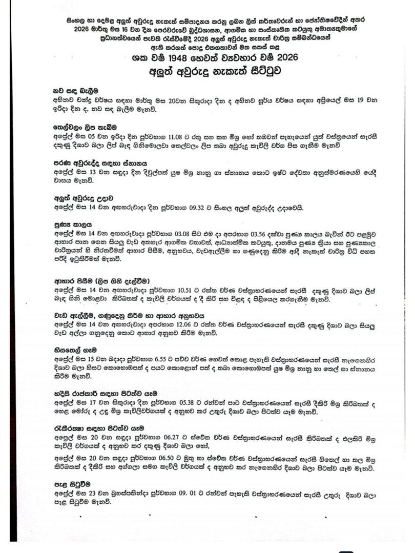 2026 අලුත් අවුරුදු නැකැත් සීට්ටුව බුද්ධ ශාසන ආගමික හා සංස්කෘතික කටයුතු අමාත්යංශය විසින් එළි දක්වා තිබේ.