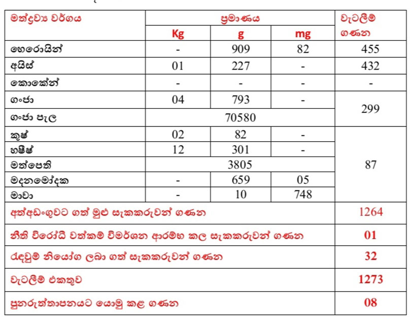 ඒ අනුව අත්අඩංගුවට ගනු ලැබූ සැකකරුවන් සහ මත්ද්රව්ය ප්රමාණ මෙසේය.