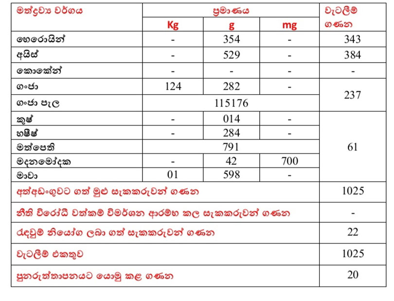 ඒ අනුව අත්අඩංගුවට ගනු ලැබූ සැකකරුවන් සහ මත්ද්රව්ය ප්රමාණ මෙසේය.