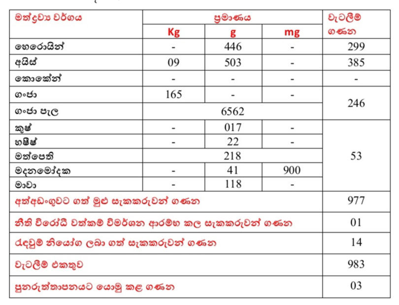 ඒ අනුව අත්අඩංගුවට ගනු ලැබූ සැකකරුවන් සහ මත්ද්රව්ය ප්රමාණ මෙසේය.
