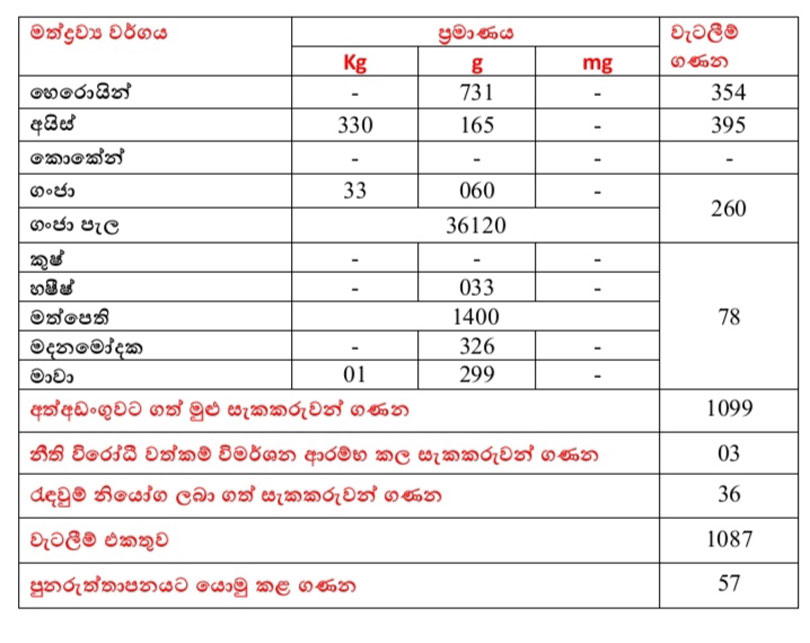 ඒ අනුව අත්අඩංගුවට ගනු ලැබූ සැකකරුවන් සහ මත්ද්රව්ය ප්රමාණ මෙසේය.