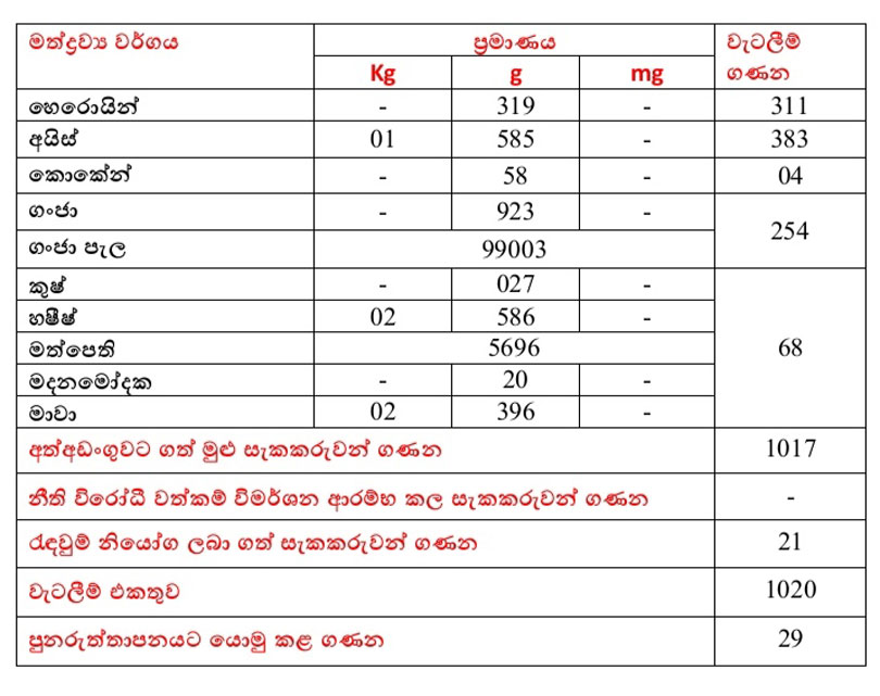 ඒ අනුව අත්අඩංගුවට ගනු ලැබූ සැකකරුවන් සහ මත්ද්රව්ය ප්රමාණ මෙසේය.