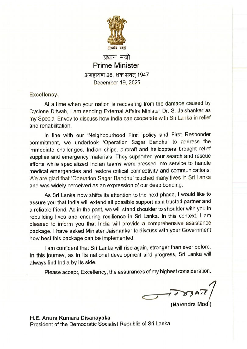 දිට්වා සුළි කුණාටුවෙන් සිදු වූ හානියෙන් ඔබේ ජාතිය යථා තත්ත්වයට පත්වෙමින් සිටින මොහොතක, සහන සහ පුනරුත්ථාපන කටයුතුවලදී ඉන්දියාවට ශ්රී ලංකාව සමඟ සහයෝගයෙන් කටයුතු කළ හැකි ආකාරය සාකච්ඡා කිරීම සඳහා විදේශ කටයුතු අමාත්ය ආචාර්ය එස්. ජයශංකර් මහතා මගේ විශේෂ නියෝජිතයා ලෙස එවමි