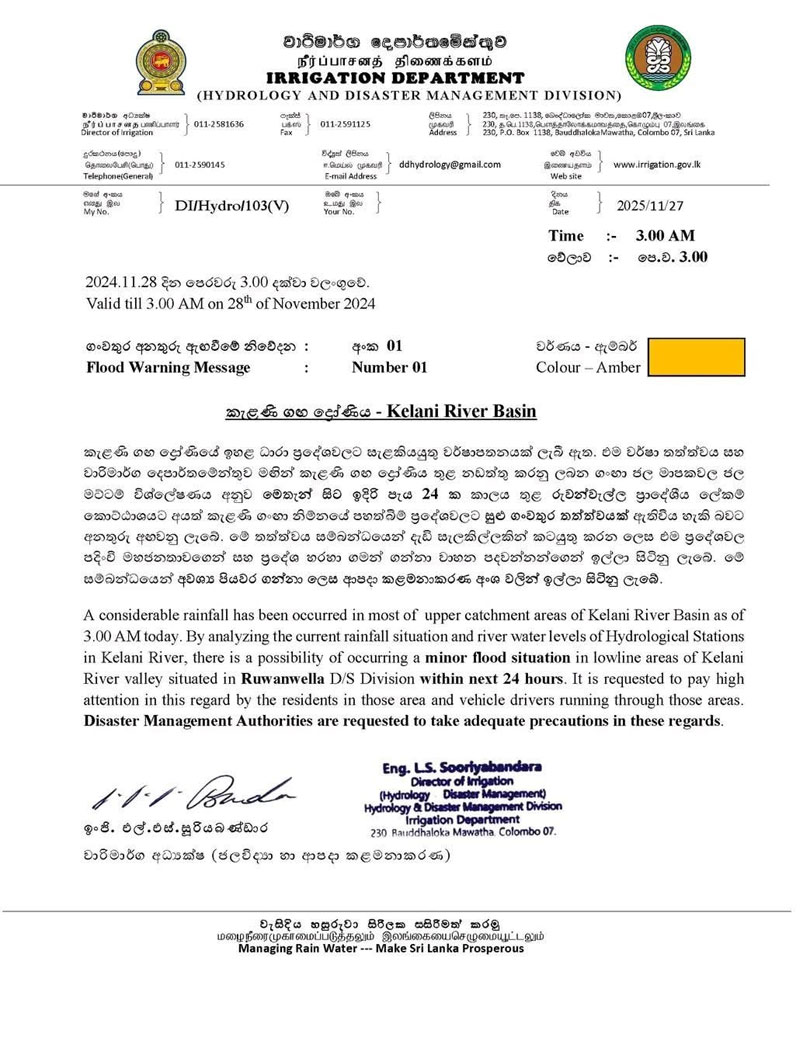 කැලණි ගඟ ද්රෝණියේ ඉහළ ප්රදේශ වලට සැලකිය යුතු වර්ෂාපතනයක් ලැබෙන හෙයින් රුවන්වැල්ල ප්රාදේශීය ලේකම් කොට්ඨාශයට අයත් පහත් බිම් වල ජනතාව ඉදිරි පැය 24ක කාලයේදී සැලකීමෙන් සිටින්නැයි වාරිමාර්ග දෙපාර්තමේන්තුව අනතුරු අඟවයි.