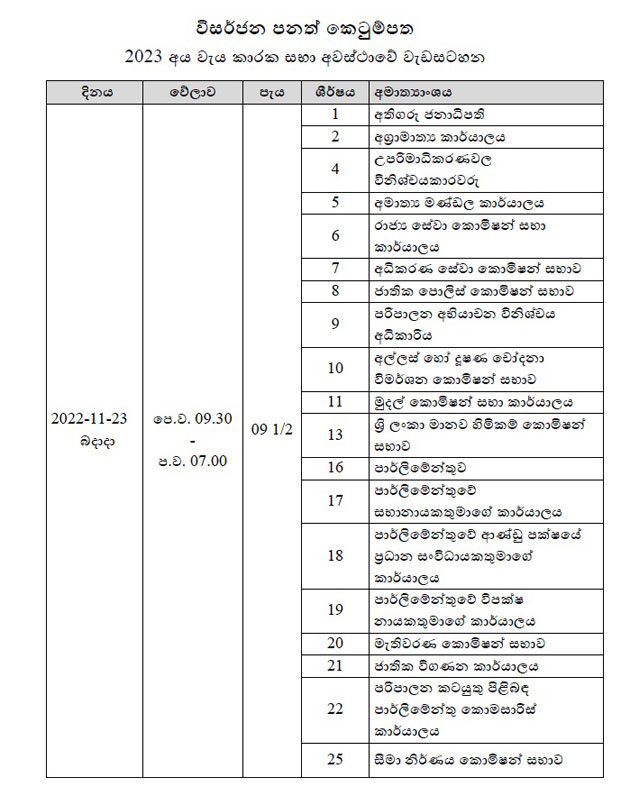 ජනාධිපති ,අගමැති කාර්යාලය, උපරමාධිකරණ වල විනිශ්චයකාරවරු ,රාජ්ය සේවා කොමිෂන් සභා කාර්යාල, අධිකරණ සේවා කොමිෂන් සභාව ,ජාතික පොලිස් කොමිෂන් සභාව ඇතුළු වැය ශීර්ෂ 25ක් මෙලෙස විවාදයට ගැනෙයි