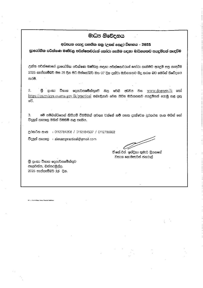 අධ්යයන පොදු සහතික පත්ර උසස් පෙළ 2025 විභාගයේ ප්රායෝගික පරීක්ෂණ මණ්ඩල පරීක්ෂකවරුන් තෝරා ගැනීම සඳහා මාර්ගගතව අයැදුම්පත් කැඳවන බව විභාග කොමසාරිස් ජනරාල් ඉන්දිකා කුමාරි ලියනගේ මහත්මිය නිවේදනය කරයි.