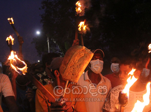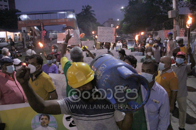 ඉන්ධන මිල ඉහළ දැමීම ඇතුලු ජීවන වියදම ඉහල යාමට විරෝධය පළකරමින් සමගි ජනබලවේගයේ නියෝජිතයින් පන්දම් දල්වමින්, ගෑස් සිලින්ඩර රැගෙන එමින් සටන් පාඨ කියමින් දෙමටගොඩ ගුවන් පාලම අසල විරෝදතාවයේ නිරතව සිටි අයුරු.