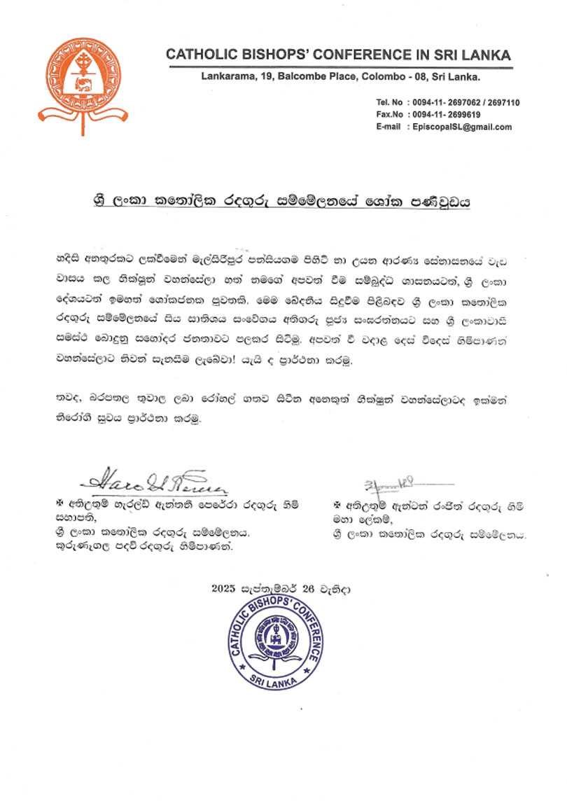 කුරුණෑගල, මැල්සිරිපුර නා උයන ආරණ්ය සේනාසන භූමියේදී හදිසි අනතුරකට ලක්ව භික්ෂූන්වහන්සේ හත් නමක් අපවත්වීම පිළිබඳව සංඝරත්නයට සහ ශ්රී ලංකාවාසී සමස්ත බොදු ජනතාවට සංවේගය පළකරන බව ශ්රී ලංකා කතෝලික රදගුරු සම්මේලනය ශෝක පණිවුඩයක් නිකුත් කරමින් පවසයි.