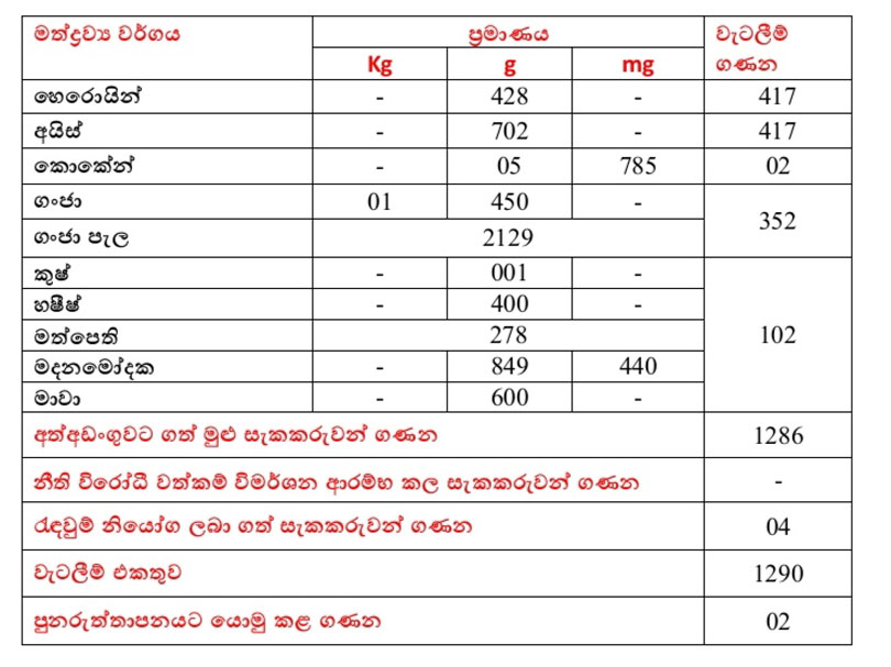 ඒ අනුව අත්අඩංගුවට ගනු ලැබූ සැකකරුවන් සහ මත්ද්‍රව්‍ය ප්‍රමාණ මෙසේය.