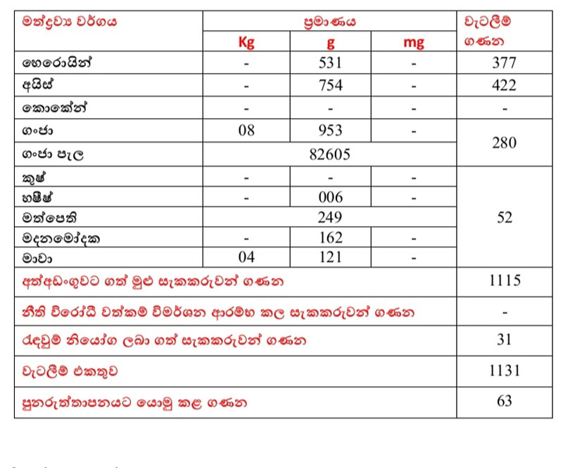ඒ අනුව අත්අඩංගුවට ගනු ලැබූ සැකකරුවන් සහ මත්ද්රව්ය ප්රමාණ මෙසේය.