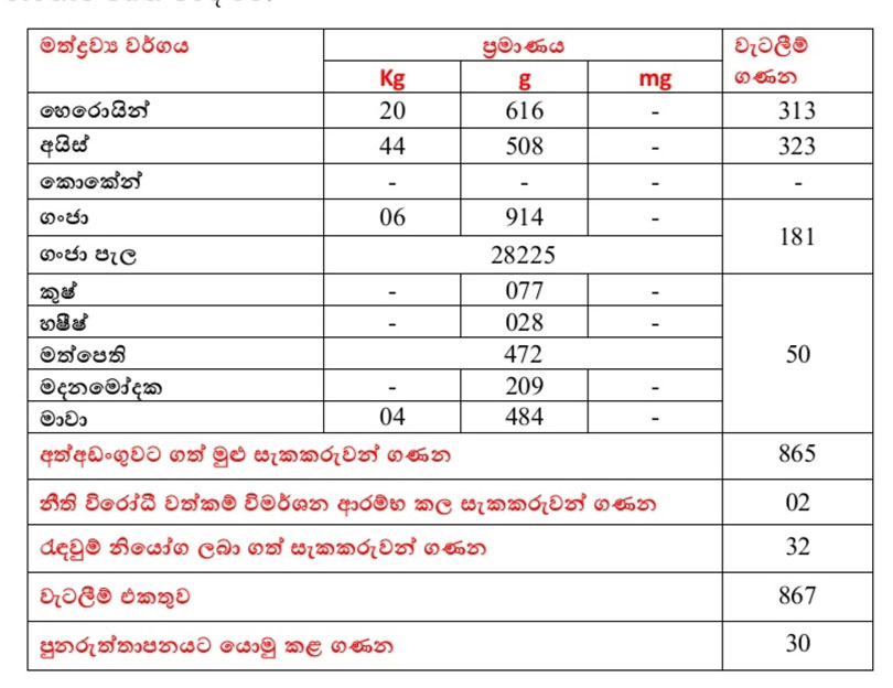 ඒ අනුව අත්අඩංගුවට ගනු ලැබූ සැකකරුවන් සහ මත්ද්රව්ය ප්රමාණ මෙසේය.