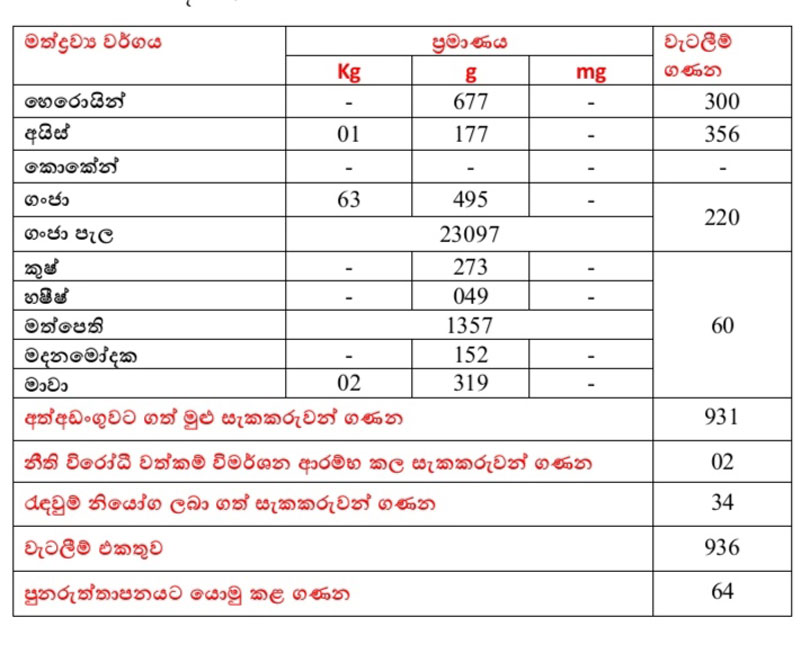 ඒ අනුව අත්අඩංගුවට ගනු ලැබූ සැකකරුවන් සහ මත්ද්රව්ය ප්රමාණ මෙසේය.