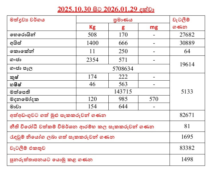 “රටම එකට” ජාතික මෙහෙයුම යටතේ ඉකුත් ඔක්තෝබර් 30 සිට මෙම ජනවාරි 29 දක්වා කළ වැටලීම් වලදී විෂ මත්ද්‍රව්‍ය වර්ග රැසකට අදාළව වැටලීම් 83382 ක් සිදු කර  සැකකරුවන් 82671දෙනකු  අත්අඩංගවට ගෙන ඇතැයි පොලිස් මාධ්‍ය කොට්ඨාස පවසයි