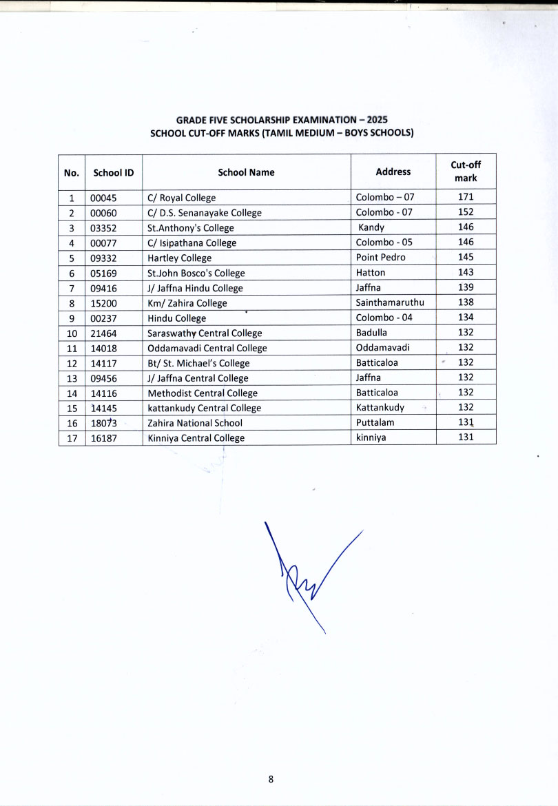 ඒ අනුව, ශිෂ්යත්ව විභාගයට පෙනී සිටි සිසුන්ට අදාළ පාසල්වල කඩඉම් ලකුණු දැනගැනීම සඳහා අධ්යාපන අමාත්යාංශයේ නිල වෙබ් අඩවිය වන www.moe.gov.lk වෙත පිවිසිය හැකි බව අධ්යාපන අමාත්යාංශය නිවේදනය කරනු ලබයි.