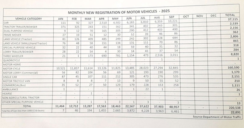 සැප්තැම්බර් මස අලුත් වාහන 49,000ක් පාරට දාලා