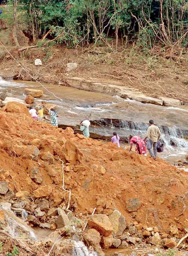 අවදානම අරන් කොහොම හරි යනවා කියලා හිතාගෙන එගොඩ වෙන්න විදිහක් කල්පනා කළා. නාය ගිය තැනින්ම ලයිට් කණු කඩාගෙන ගිය කම්බි තිබුණා. යන්න තැනක් නැති නිසා ඔයෙන් තමයි එහා පැත්තට යන්න වුණේ. අඩි 150 ක විතර දුරක් ඔය මැදින් එගොඩ වෙන්න තිබුණා. වතුර ප්රමාණය වැඩියි. ගල් ලිස්සනවා. ලිස්සුවොත් අල්ලගන්වත් ගලක් නෑ. ඒ තරමට දියසෙවෙල. කැඩිච්ච ලයිට් කම්බි දෙකක් අටවගෙන බඩටත් ලණුවකුත් දාලා එක පැත්තක් කම්බියේ ගැට ගහල නෙළුම් කොළෙ උඩ කොරවක්ක යනවා වගේ තමයි ඔයෙන් එගොඩ වුණේ.