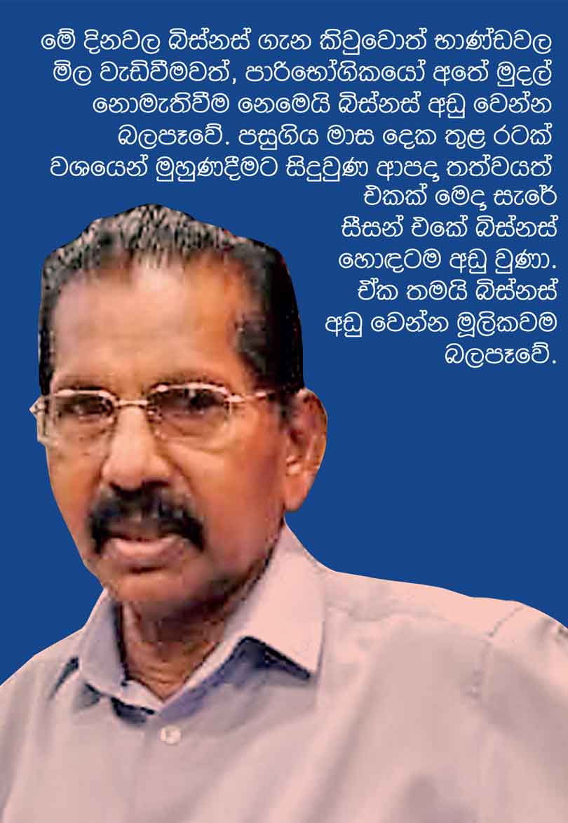 මේ දිනවල බිස්නස් ගැන කිවුවොත් භාණ්ඩවල මිල වැඩිවීමවත්, පාරිභෝගිකයෝ අතේ මුදල් නොමැතිවීම නෙමෙයි බිස්නස් අඩු වෙන්න බලපෑවේ. පසුගිය මාස දෙක තුළ රටක් වශයෙන් මුහුණදීමට සිදුවුණ ආපදා තත්වයත් එකක් මෙදා සැරේ සීසන් එකේ බිස්නස් හොඳටම අඩු වුණා. ඒක තමයි බිස්නස් අඩු වෙන්න මූලිකවම බලපෑවේ.