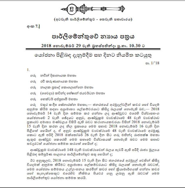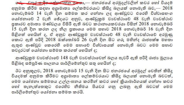 14 වැනි දා පැවැති විශ්වාස භංගය සම්මත වීමෙන් පසු අගමැතිවරයකු සහ ආණ්ඩුවක් නොමැති බැවින් රජයේ මුදල් අනුමත කිරීමට අග්රාමාත්ය ලේකම්වරයාට බලයක් නොමැති බව මෙම යෝජනාවේ සඳහන්වේ.