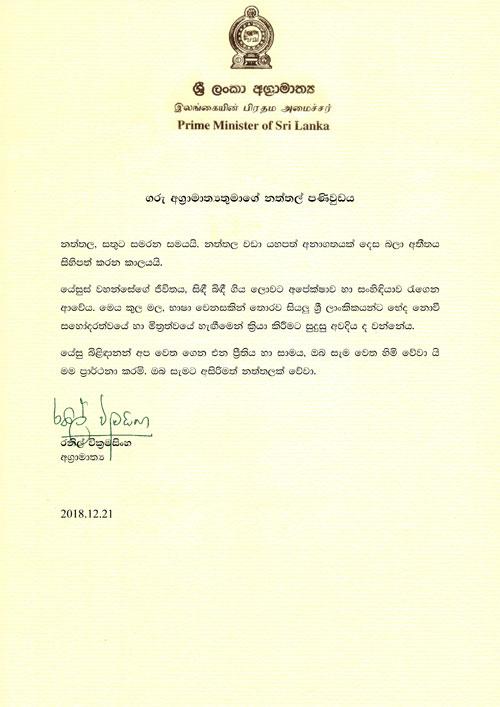අග්රමාත්ය රනිල් වික්රමසිංහ මහතාගේ නත්තල් පණිවුඩය පහත දැක්වේ.