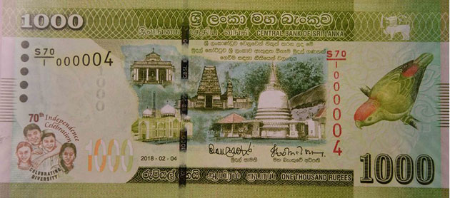 ලබන 4 වැනි දා ට යෙදෙන 70 වැනි නිදහස් සැමරුම නිමිති කරගනිමින් ශ්රී ලංකා මහ බැංකුව රුපියල් 1000ක වටිනාකමකින් යුත් සමරු නෝට්ටුවක් නිකුත් කර තිබේ.
