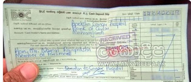 පාර්ලිමේන්තු මන්ත්රී නාමල් රාජපක්ෂ මහතා සිය අපේ්රල් මස මන්ත්රී වැටුප මහරගම අපේක්ෂා රෝහලට අවශ්ය වෛද්ය උපකරණ ලබාදීම වෙනුවෙන් ක්රියාත්මක ‘ෆයිට් කැන්සර්’ ව්යාපෘතිය වෙත අද (17) පරිත්යාග කර තිබේ.