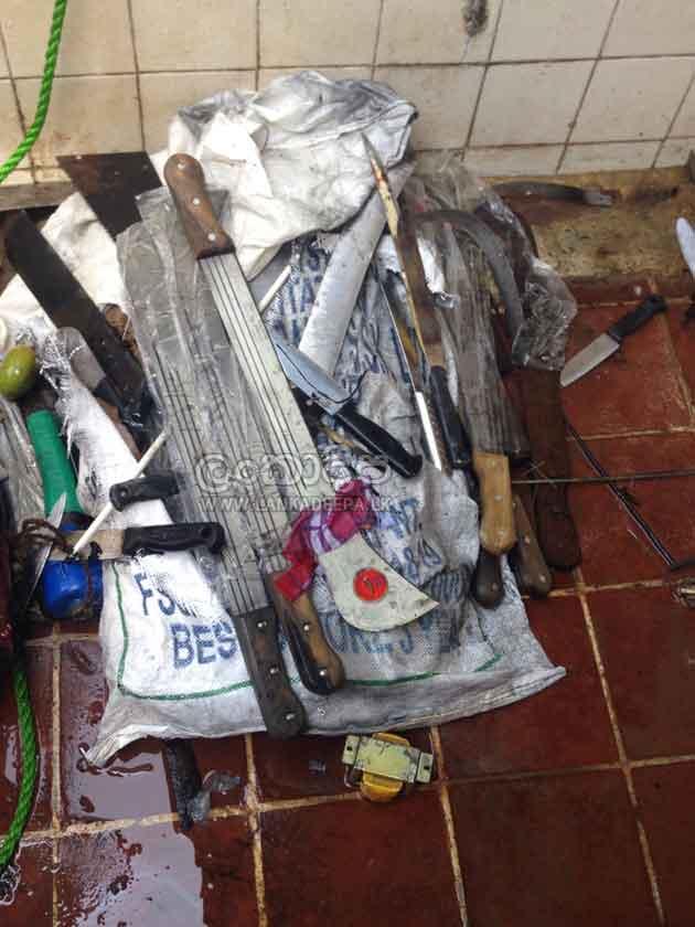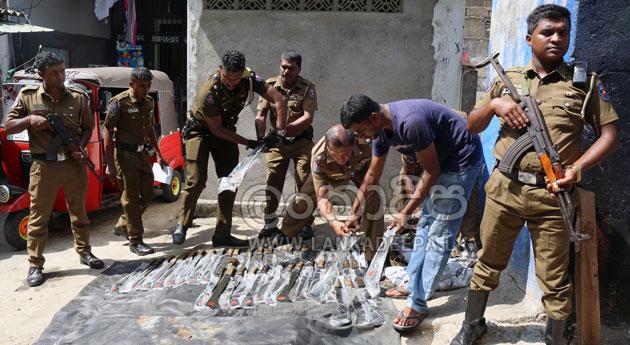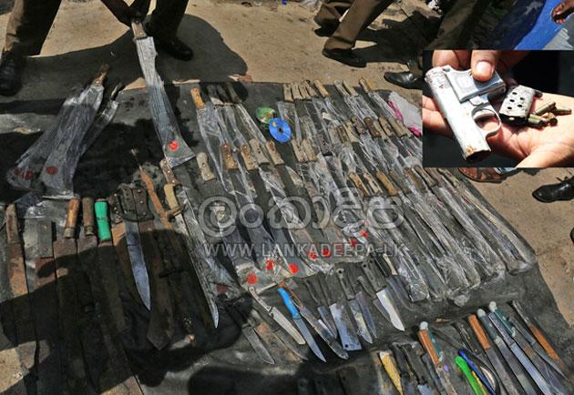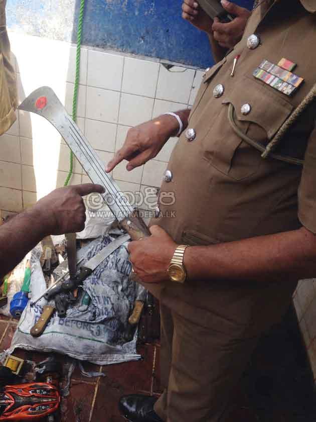 කඩු 46 ක්, පතුරොම් පිරවූ තුවක්කුවක්, කිණිසි, පිහි, උපකරණ මෙහි තිබී සොයාගෙන ඇත. අයිස් නම් මත්ද්රව්ය යැයි සැක කෙරෙන මත් ද්රව්ය පැකැට්ටුවක්ද එහිදී හමු වූ බව පොලීසිය සඳහන් කරයි.