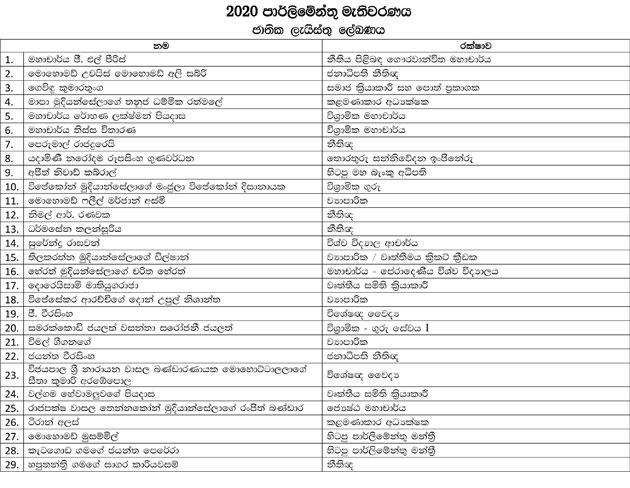 ඊට අමතරව ජනාධිපති නීතීඥ අලී සබ්රි, මහාචාර්ය වරිත හේරත්, හිටපු ආණ්ඩුකාරවරුන් වන මහාචාර්ය තිස්ස විතාරණ, සීතා අරඹේපොළ යන මහත්ම මහත්මීන් ජාතික ලැයිස්තුවට ඇතුළත්ව ඇත.