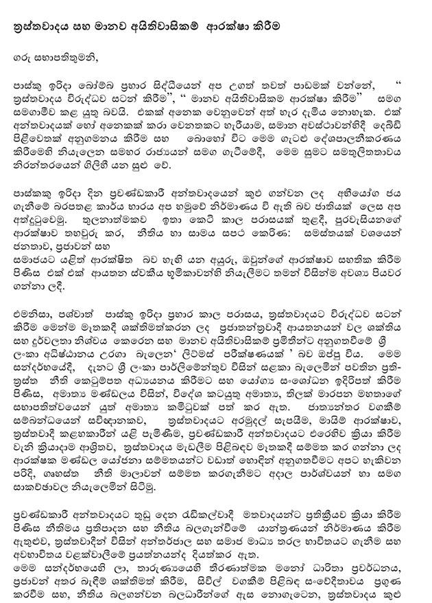 පාස්කු ඉරිදා ප්රහාරවලින් පසුව ‘ත්රස්තවාදයට එරෙහිව සටන් කිරීම’ සහ ‘මානව හිමිකම් ආරක්ෂා කිරීම’ එකිනෙක සම සමව සිදුකළ යුතුය යන පාඩම අප උගත් බවත් එකක් වෙනුවෙන් අනෙක මඟ හැරිය නොහැකි බවත් ආර්යසිංහ මහතා කීවේය.