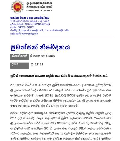 මූඩීස් ආයතනයේ නවතම ශ්රේණිගත කිරීමේ තීරණය පදනම් විරහිත යැයි කියන ශ්රී ලංකා මහ බැංකුව මෙරට විදේශ විනිමය ණය නිකුත් කිරීම හා ජ්යෙෂ්ඨ සුරැකුම් රහිත ණය ශ්රේණිගත කිරීම් බීඒ (ඍණ) සිට බී2 (ස්ථාවර ) දක්ව පහත හෙළීමෙන් රටේ සාර්ව ආර්ථික මූලධර්ම නිසිලෙස පිළිබිඹු නොකරන බව ද එම තීරණය සාධරණ නැත බව ද සඳහන් කර ඇත.
