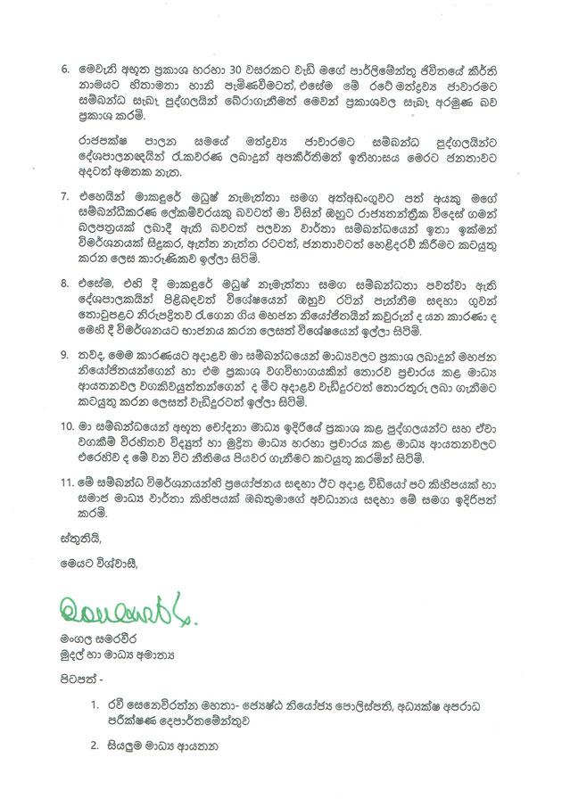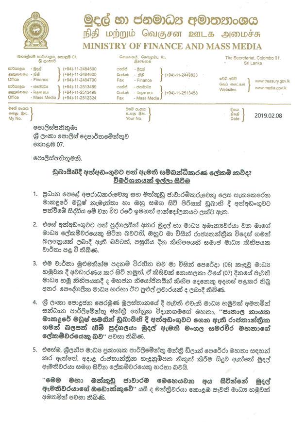මාකඳුරේ මධූෂ් නැමැත්තා සමඟ ඩුබායිහිදී අත්අඩංගුවට පත් පුද්ගලයෙකු තමාගේ සම්බන්ධීකරණ ලේකම්වරයෙකු බවත් තමා ඔහුට රාජ්ය තාත්ත්රීක ගමන් බලපත්රයක් ලබාදී ඇති බවත් දේශපාලඥයින් පිරිසක් නඟන චෝදනා සම්බන්ධයෙන් විමර්ශනයක් ආරම්භ කරන්නැයි ඉල්ලා මුදල් හා ජනමාධ්ය අමාත්ය මංගල සමරවීර මහතා පොලිස්පතිවරයාට අද (08) පැමිණිල්ලක් කර තිබේ.