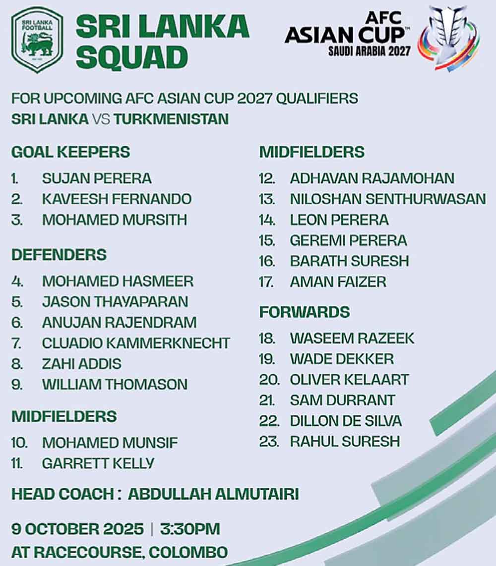 වසර 2026 මාර්තු 21 වැනිදා දක්වා පැවැත්වෙන ආසියානු කුසලාන (2027 - සෞදි අරාබිය) පාපන්දු තරගාවලියේ අවසන් වටයට කණ්ඩායම් 24 සම්පූර්ණ කර ගැනීම සඳහා දැන් පැවැත්වෙන නිර්දේශ තෙවැනි වටය යටතේ ශ්රී ලංකාව ඩී කාණ්ඩයෙන් තරග වදියි. එහිදී මෙතෙක් පැවැති තරගවලදී ශ්රී ලංකාව ජාත්යන්තර පාපන්දු තරග ඉතිහාසයේ පළමු වතාවට තුර්ක්මෙනිස්ථානය පරාජයට පත් කිරීමට (1 - 0) සමත් විය. මෙම තරග වටයේදී මේ වන විට ශ්රී ලංකාව ප්රබල චීන - තායිපේ ගෝල 3 - 1 කින් පරාජය කිරීමටද සමත්ව සිටියි.